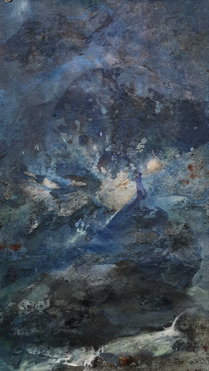 Sur la toile, un souffle retenu, comme un secret que l'ombre jalouse, un murmure de l'âme qui s'éveille. Une étoile, poussière de lune, s'éloigne en silence, laissant derrière elle une constellation de souvenirs, des fragments d'un monde qui se métamorphose. Requiem pour la terre et l'âme, blessures offertes au vent du changement, cicatrices d'une transformation profonde. Pourtant, au cœur de l'obscurité, une lueur tremble, une graine d'espoir serrée dans le poing de la terre, une promesse d'un monde à retrouver au-delà des songes, un refuge pour l'âme qui cherche son chemin dans le labyrinthe du temps.